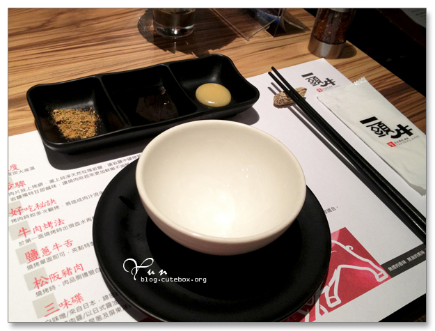 桌上的三味碟由左至右為~ 孜然粉、日式燒肉醬、白味噌