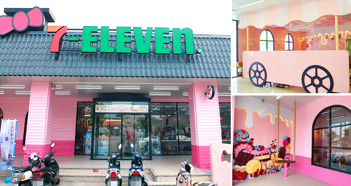 更犯規的是招牌7-ELEVEN頭上還加了粉紅小蝴蝶結,乍看之下還誤以為是Hello Kitty的家呢!