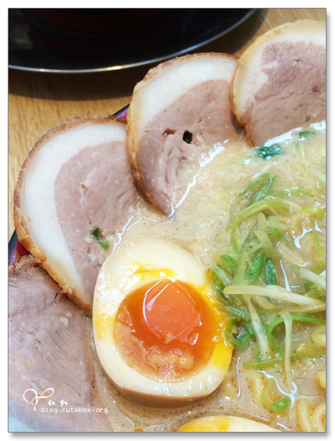(大部分在台灣看到的拉麵都加了豆芽菜、魚板,蛋也只是水煮蛋切半,整個就是差很大~~)