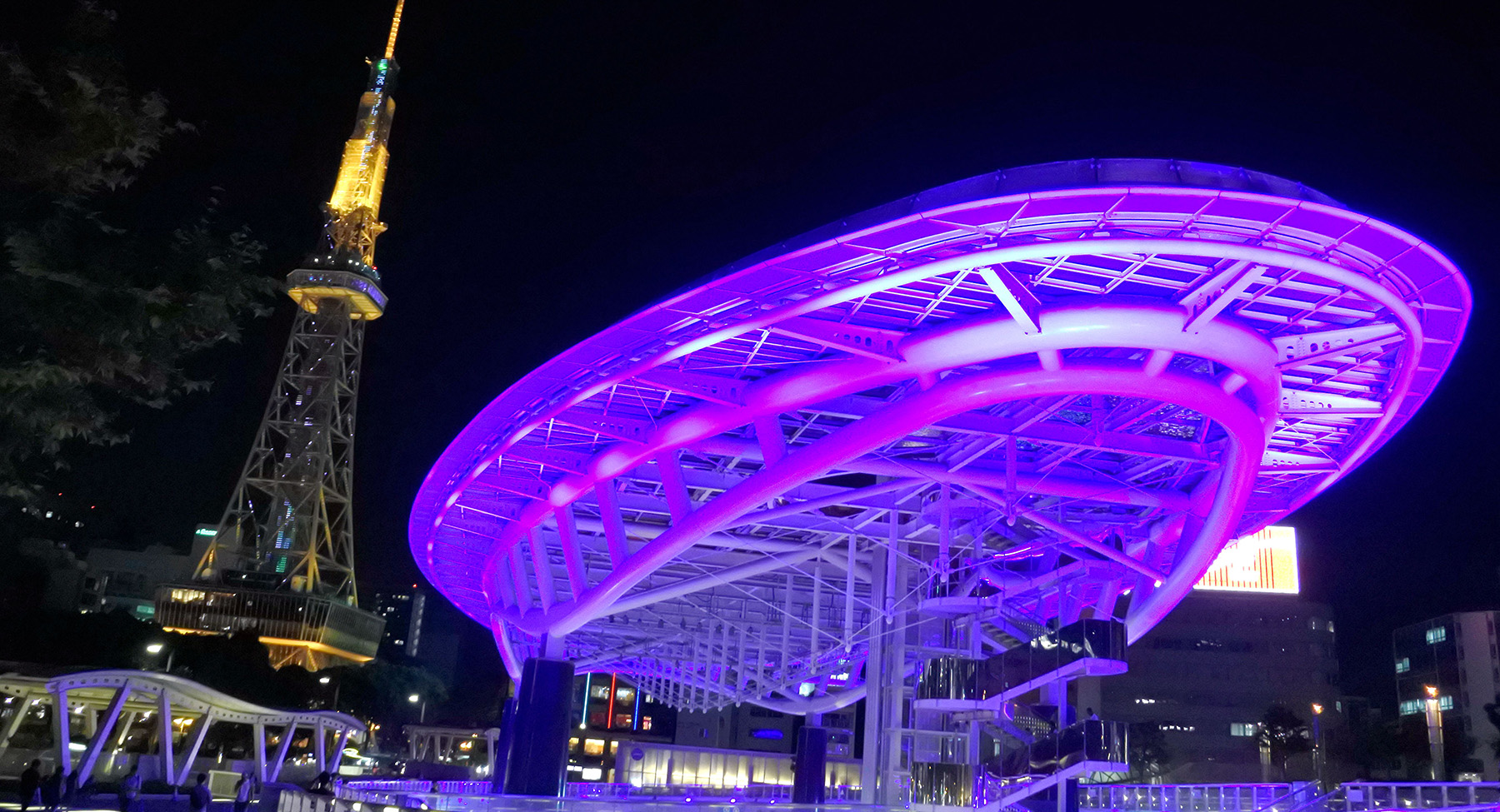 變換成紫色的宇宙船綠洲21,和呈現黃光的名古屋電視塔形成強烈對比~