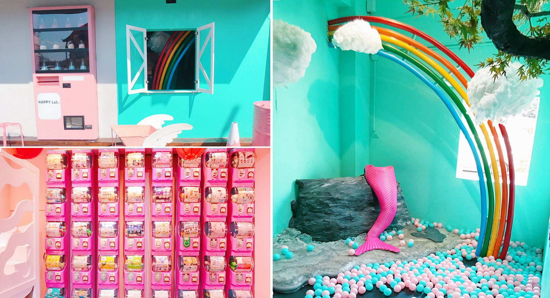 Happy Lab. 以白色及湖水綠牆面搭配粉粉的販賣機、大彩虹