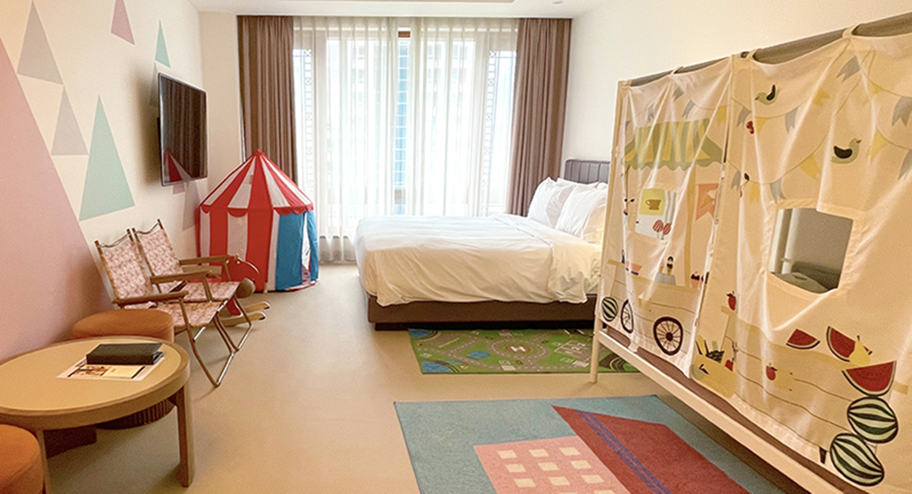 這次我們訂的是兒童房,雙人床加上下舖,一家四口住起來剛剛好。小孩有獨立的睡眠空間不會互相影響,另外有孩子期待已久的小帳棚,兄妹倆原本還吵著說要睡帳篷裡,結果是遊戲小帳棚~