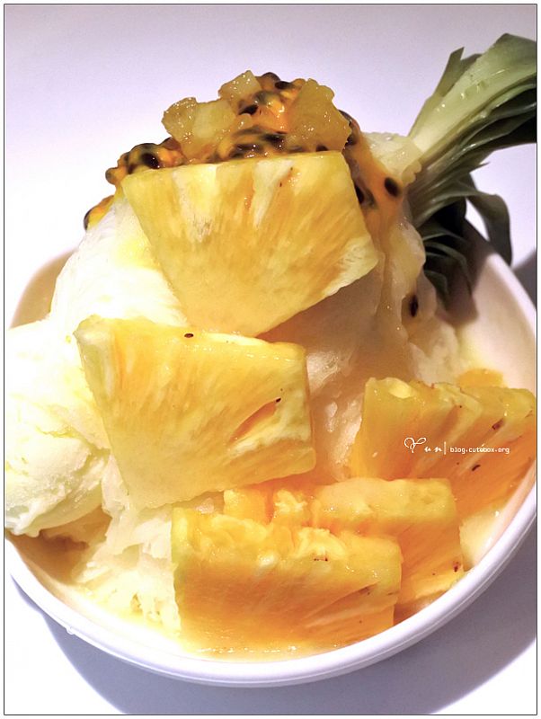 鳳梨口味雪花冰,淋上鳳梨小碎粒及酸中帶甜的百香果