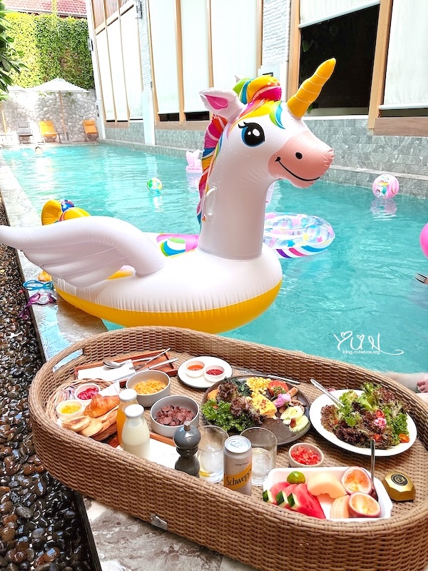 一早醒來,就被「漂浮在泳池上的早午餐」療癒了!泳池裡漂著可愛的獨角獸泳圈,水面閃著陽光,小孩已經迫不及待換上泳裝跳進水裡,旁邊還有人悠閒游泳,滿滿度假感氛圍。